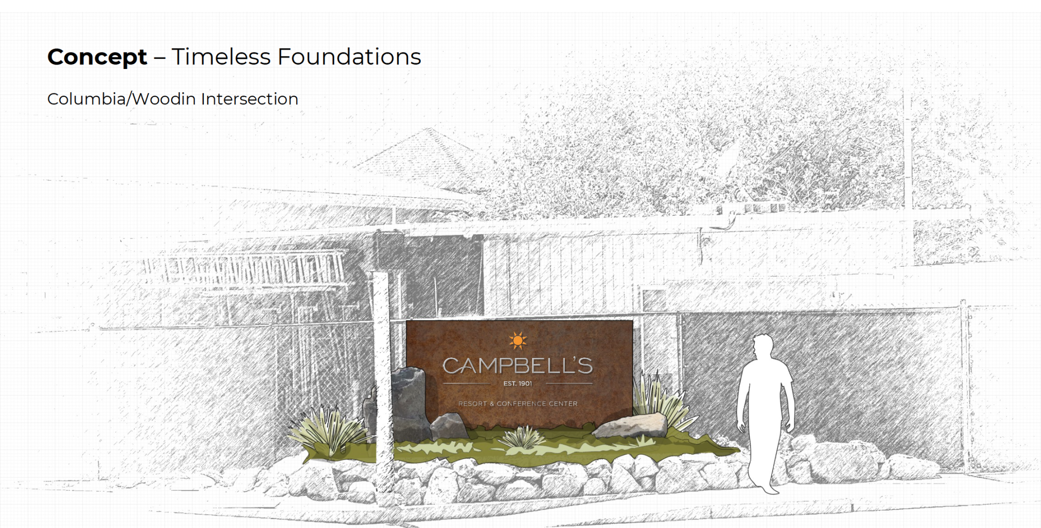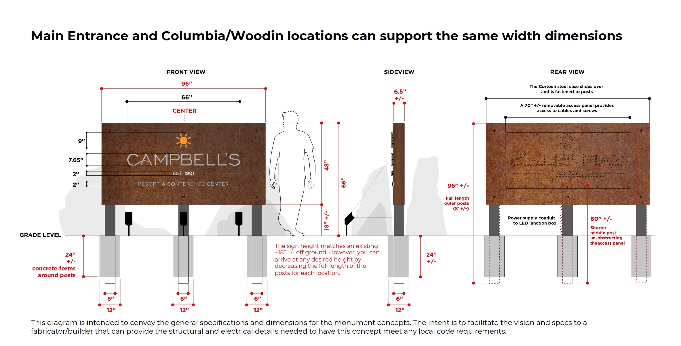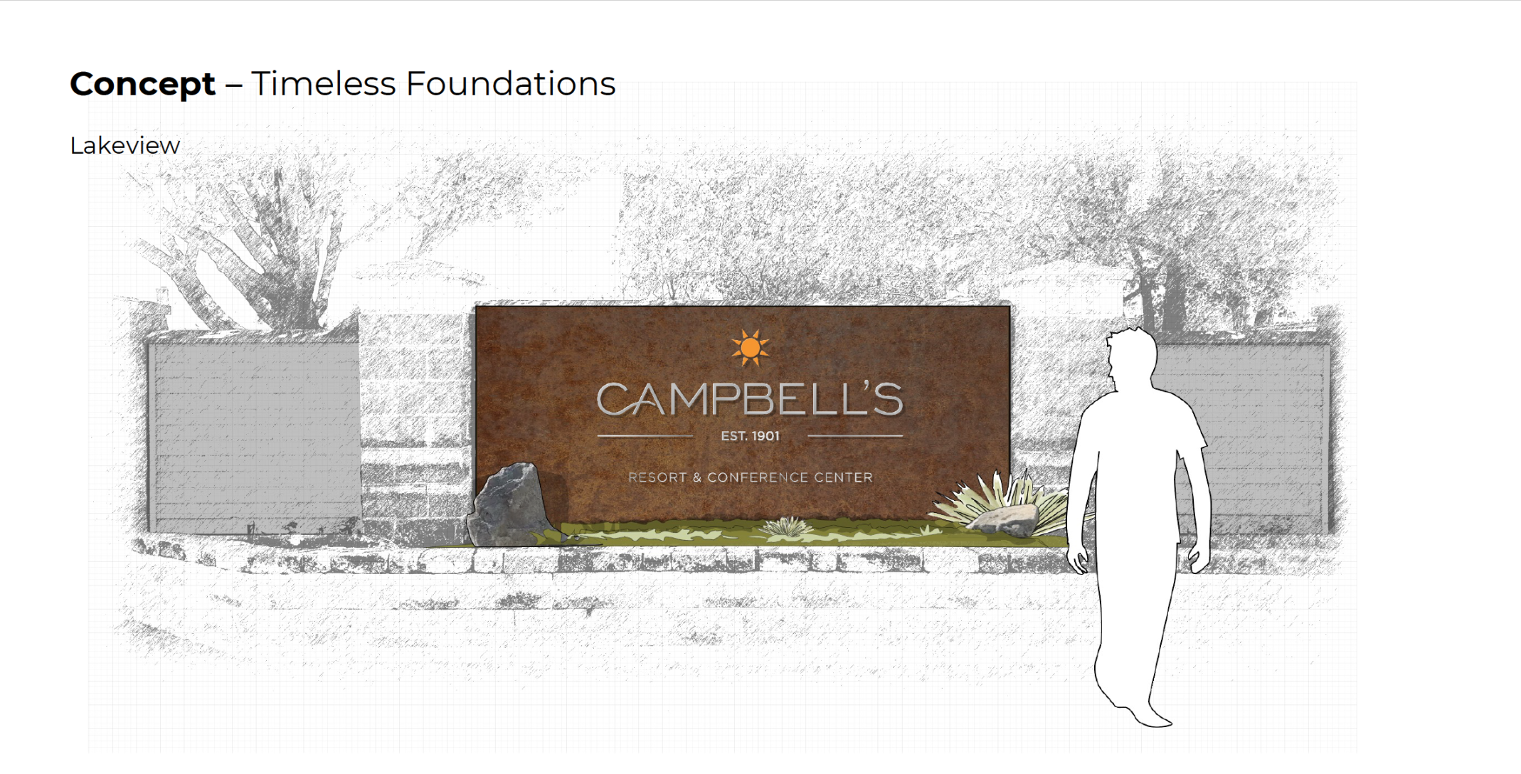 I worked with the Campbell's team to create comprehensive monument sign designs for the resort's main entrance, and two other high visibility areas. The monument sign was carefully designed to serve both functional and aesthetic purposes, featuring internally illuminated lights that glow for enhanced visibility during the resort's extended summer evenings and early morning hours. The signs integrate seamlessly with the resort's existing architectural style, extending the use of Corten steel used throughout the resort, along with thoughtful landscaping elements to create welcoming focal points that enhance the overall guest experience while maintaining the natural beauty of the lakeside setting.