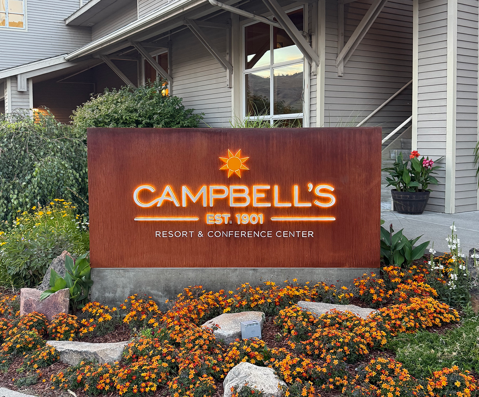 I worked with the Campbell's team to create comprehensive monument sign designs for the resort's main entrance, and two other high visibility areas. The monument sign was carefully designed to serve both functional and aesthetic purposes, featuring internally illuminated lights that glow for enhanced visibility during the resort's extended summer evenings and early morning hours. The signs integrate seamlessly with the resort's existing architectural style, extending the use of Corten steel used throughout the resort, along with thoughtful landscaping elements to create welcoming focal points that enhance the overall guest experience while maintaining the natural beauty of the lakeside setting.